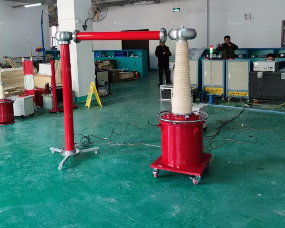 把電源輸入有過(guò)流自動(dòng)脫扣及防止突發(fā)加壓的零位連鎖裝置的控制箱,經(jīng)自耦調(diào)壓器調(diào)節(jié)電壓輸入YDQ充氣式試驗(yàn)變壓器初級(jí)繞組,根據(jù)電磁感應(yīng)原理,在次級(jí)(高壓)繞組按其與初級(jí)繞組匝數(shù)之比可獲得同等倍數(shù)的電壓幅值-工頻高壓。此工頻高經(jīng)高壓硅堆整流及穩(wěn)壓電容器濾波可取得直流高壓,其幅值是工頻高壓有效值的2倍。