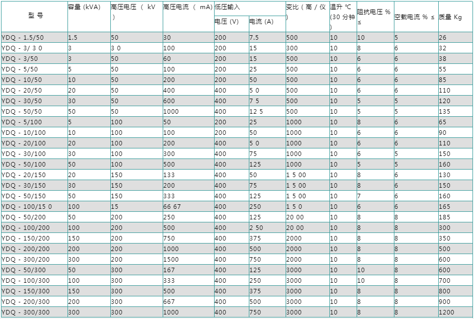 | 規(guī)格型號(hào) | 容量(kVA) | 高壓電壓(kV) | 高壓電流(mA) | 低壓輸入 | 變比(高/儀) | 溫升℃(30分鐘) | |