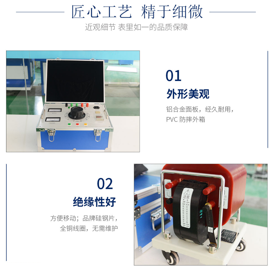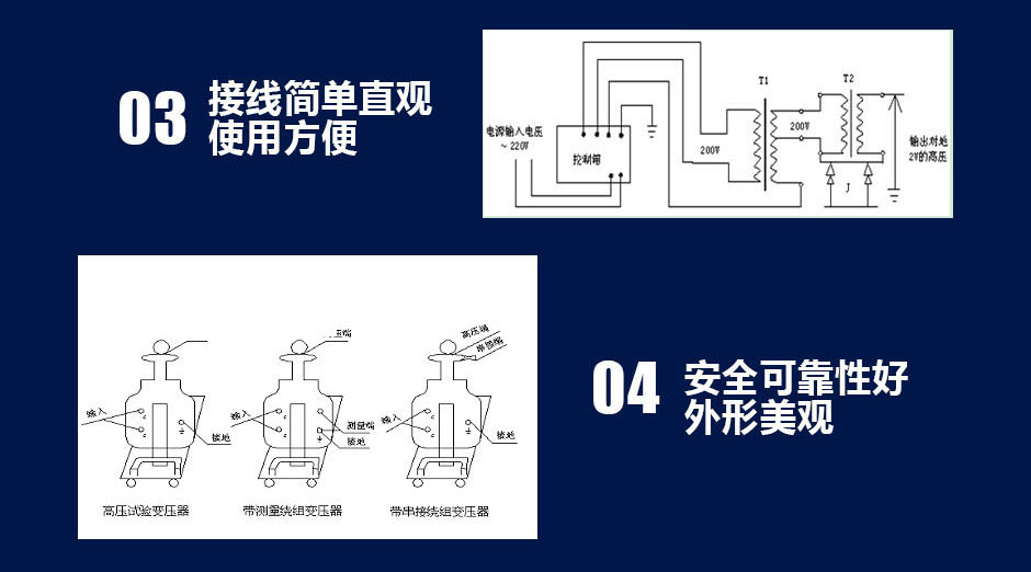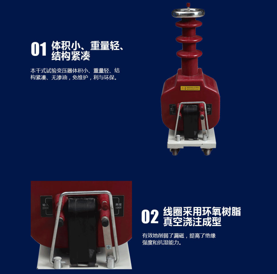 干式試驗變壓器與其同容量油浸式實驗變壓器相比具重量輕,操作方便,無滲漏油等優(yōu)點。