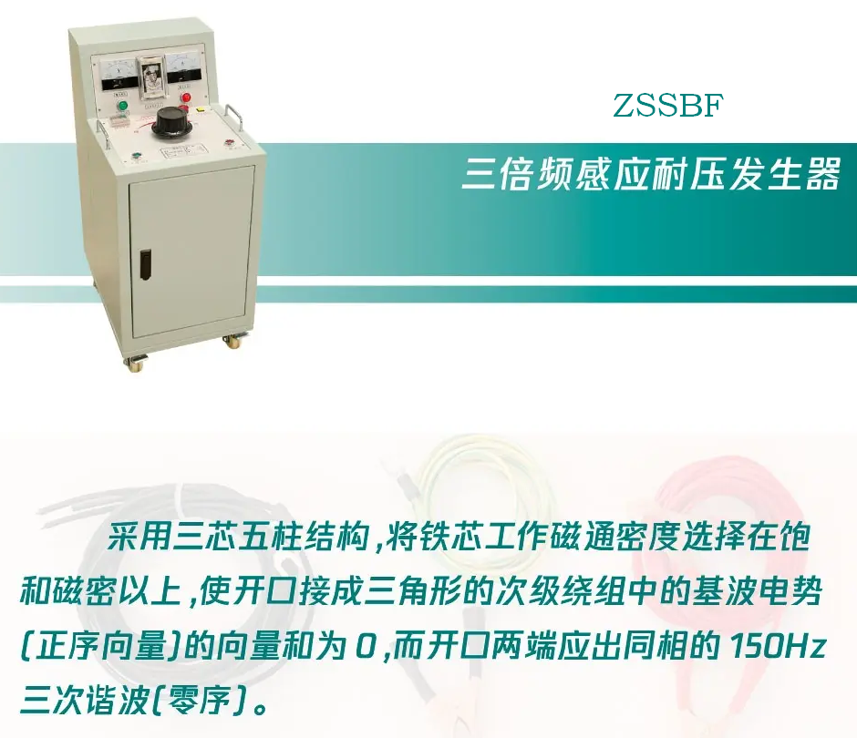 ZSSBF三倍頻感應(yīng)耐壓裝置是利用磁路的飽和特性,取出諧波中分量的三次諧波電壓,作為發(fā)生器的電源,對感應(yīng)線圈式的電氣產(chǎn)品作匝間、段間、層間的倍頻、倍壓試驗(yàn);以考核線圈的絕緣強(qiáng)度、耐壓水平。