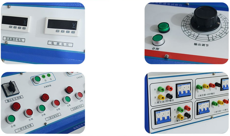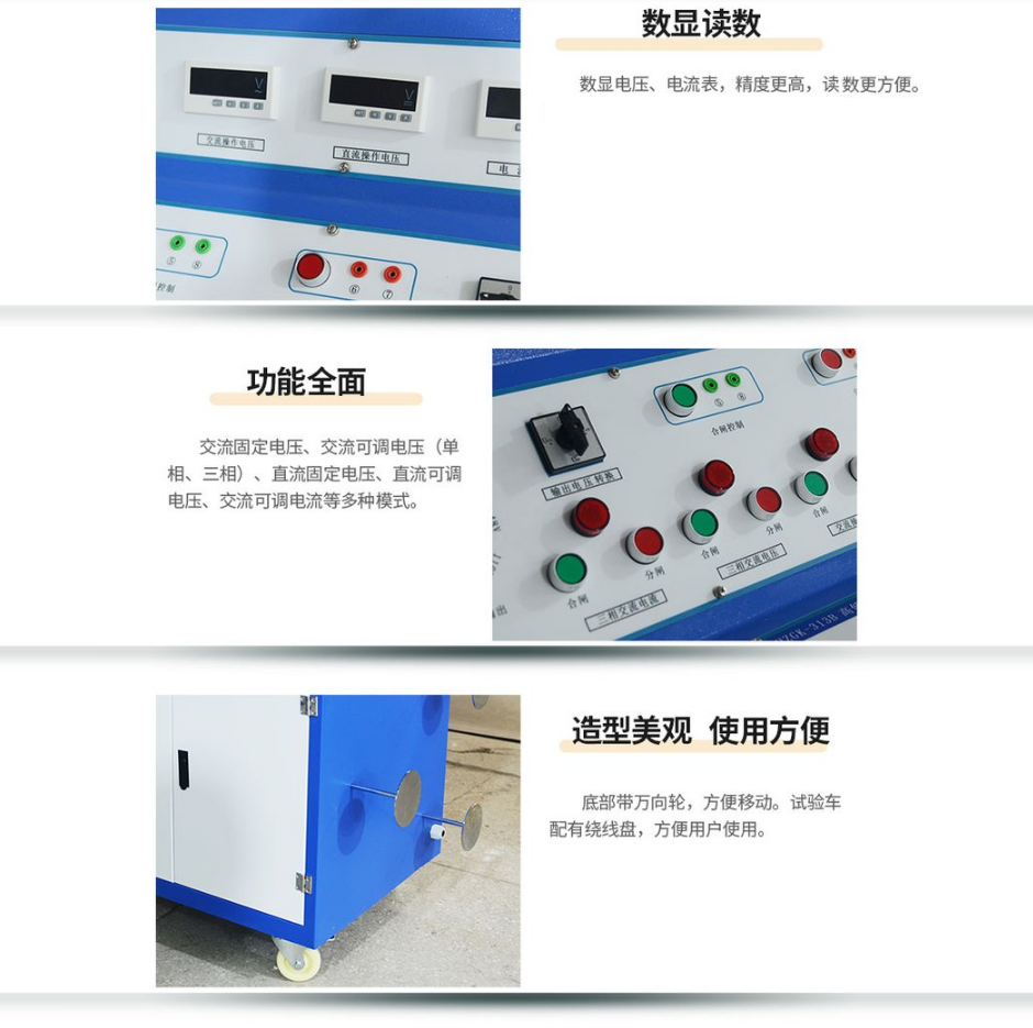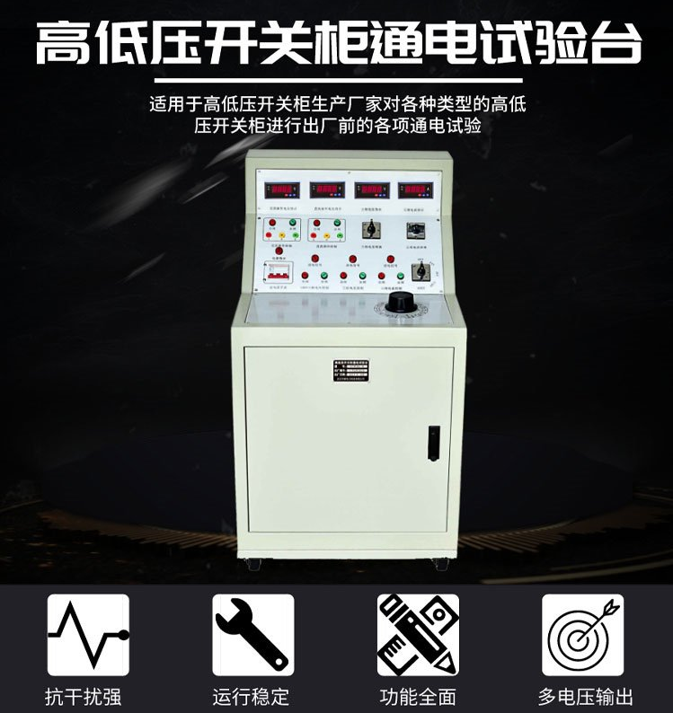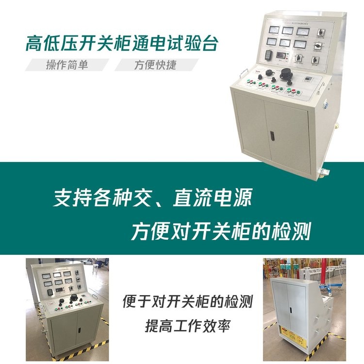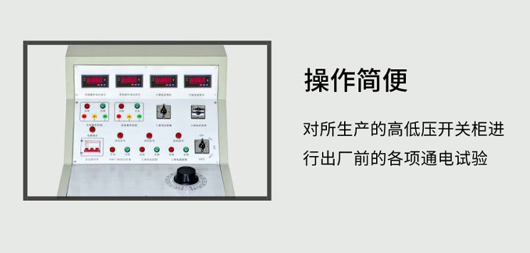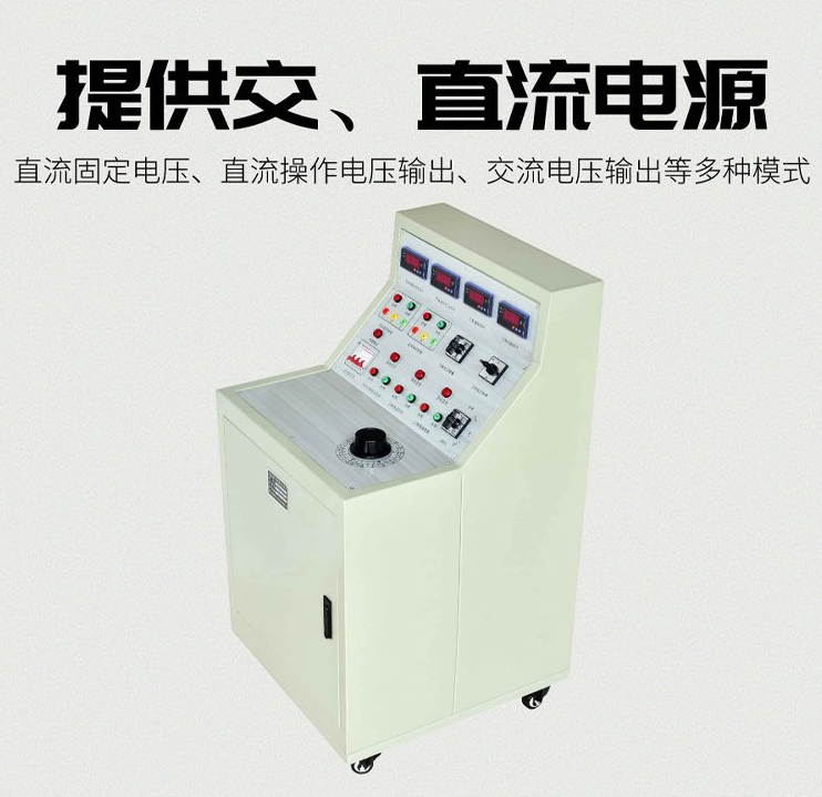 用于高低壓開關柜生產(chǎn)廠家對所生產(chǎn)的高低壓開關柜進行出廠前的各項通電試驗。它能提供各種交、直流電源,便于對開關柜的檢測,提高工作效率。