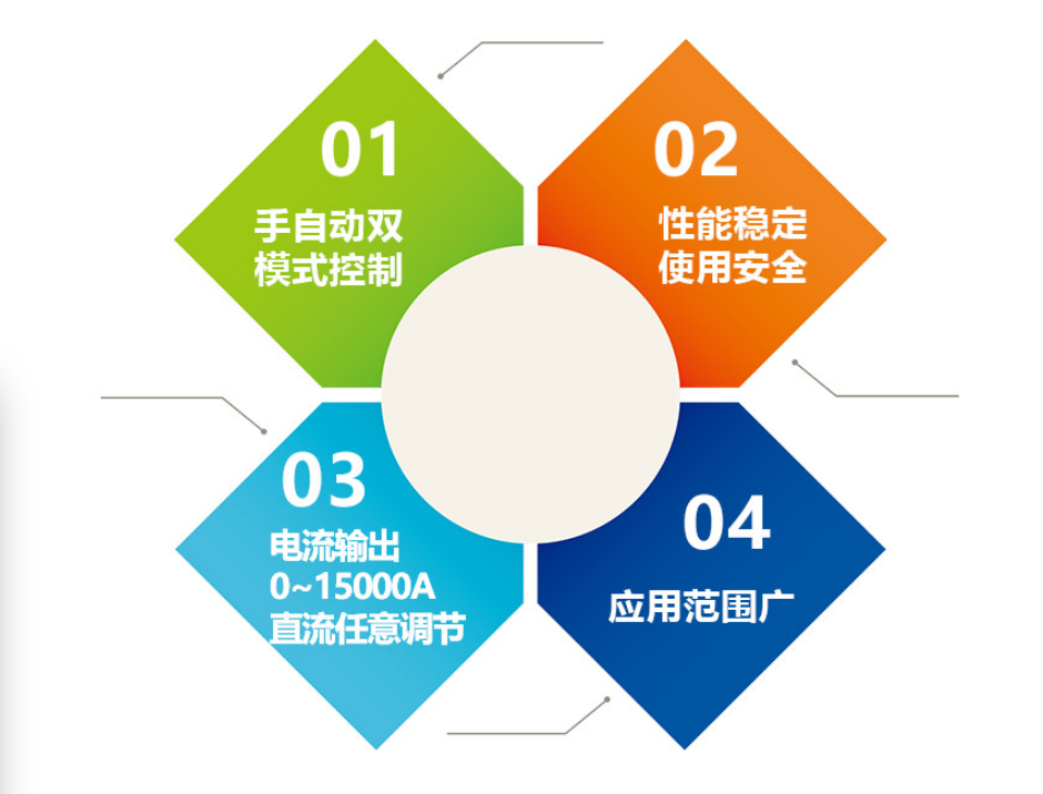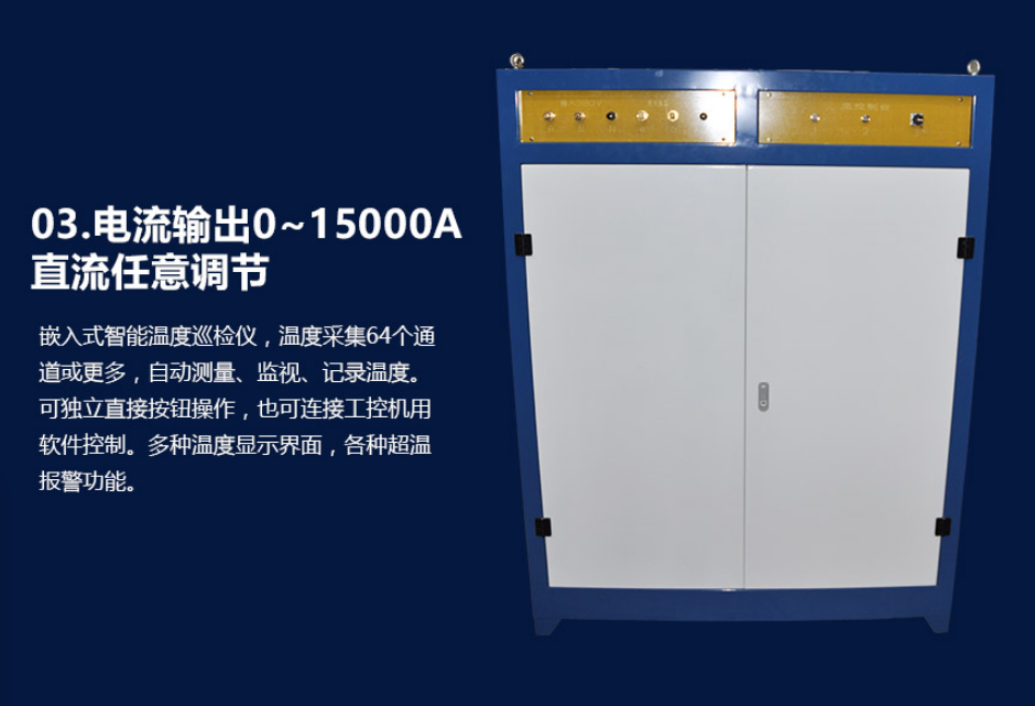 3、電流輸出0~15000A直流任意調(diào)節(jié),輸出調(diào)節(jié)平穩(wěn)可靠 外殼采用304不銹鋼殼體,杜絕強(qiáng)磁場(chǎng)對(duì)外殼產(chǎn)生的渦流現(xiàn)象;