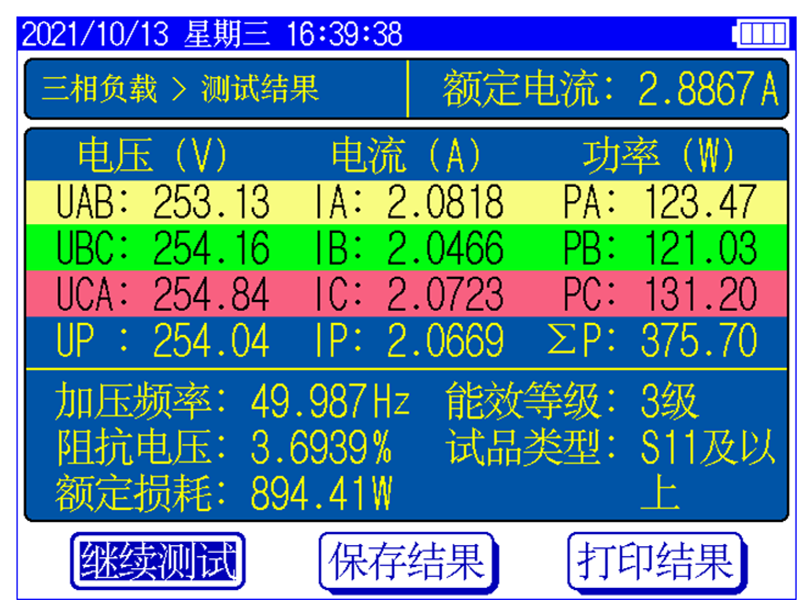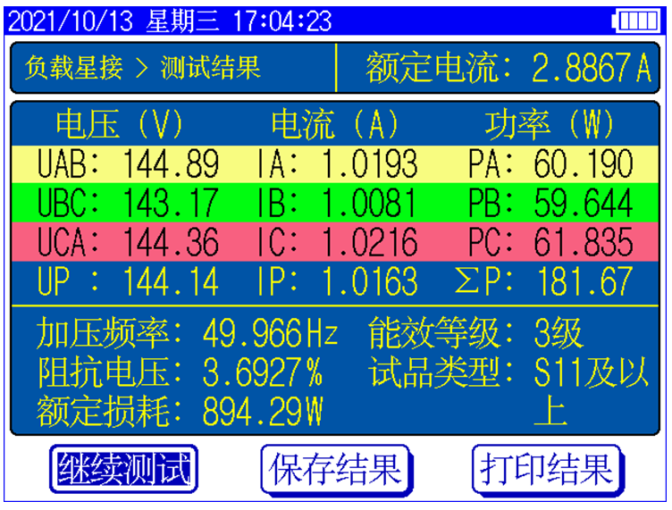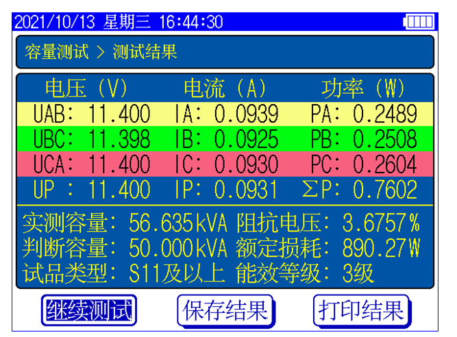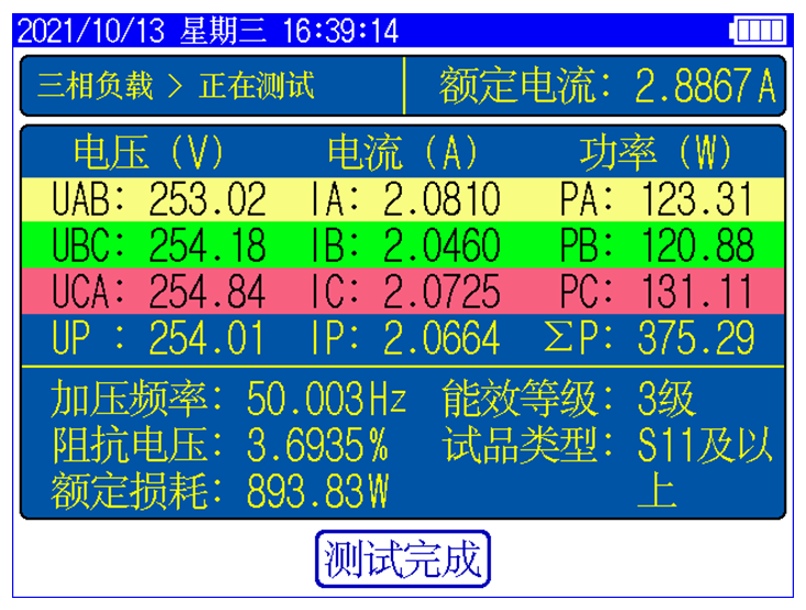 顯示三相電壓、三相電流、三相功率,自動計(jì)算出變壓器的阻抗電壓百分比,折算到額定溫度、額定電流下的負(fù)載損耗,自動判斷出油浸式或干式配電變壓器的鐵芯型號,測試過程中具有報(bào)警自適應(yīng)提示功能,方便現(xiàn)場用戶使用。