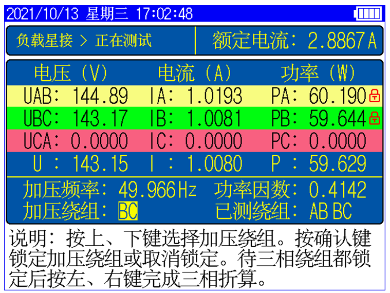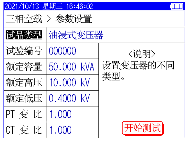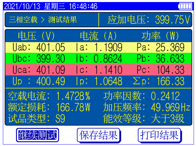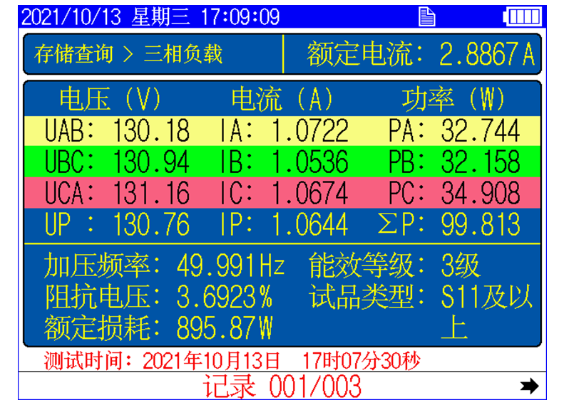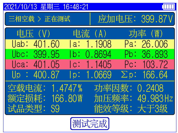 儀器顯示三相電壓、三相電流、三相功率,儀器顯示施加電源波形的畸變率,自動計(jì)算出變壓器的空載電流折算到額定電壓下且進(jìn)行了波形畸變校正的空載損耗,并顯示油浸式或干式配電變壓器鐵芯的型號。