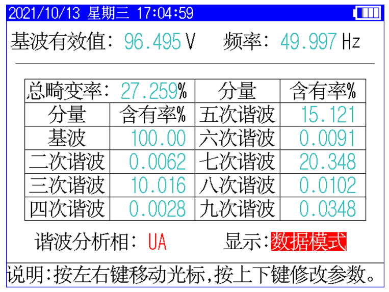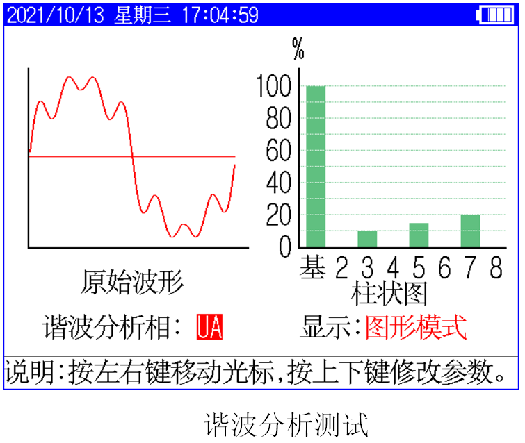 8、儀器具有諧波分析功能,可測量多次諧波的含有率及總畸變率,并帶有原始波形及柱狀圖顯示。
