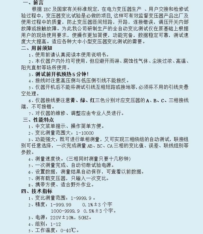 全自動變比組別測試儀是以單片機為核心進行測量計算和自動控制,全中文菜單操作界面,具有顯示直觀、穩(wěn)定性好、精度高、測量范圍寬且現(xiàn)場不需三相電源等優(yōu)點的新一代智能化變比測試儀器。國標GB1094-79規(guī)定:“電力變壓器的變壓比,除電壓在35KV以下且小于3的變壓器允許偏差為 0.5%”。對于傳統(tǒng)的變比測量方法,大多采用QJ35電橋,其變比測量倍率低,操作繁瑣,精度難以保證。已經(jīng)不能適應(yīng)現(xiàn)代測量快節(jié)奏,高效率的要求。為此,我公司采用現(xiàn)代電子技術(shù),研制出了新一代全自動變比組別測試儀。