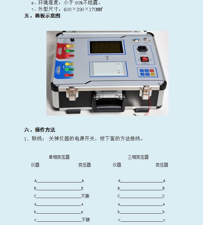 3.功能強大:既可進行單相測量,又可實現(xiàn)三相繞組的自動測試,聯(lián)接組別可任意選擇,一次完成測量AB、BC、CA三相的變比值、誤差、聯(lián)線組別等參數(shù);