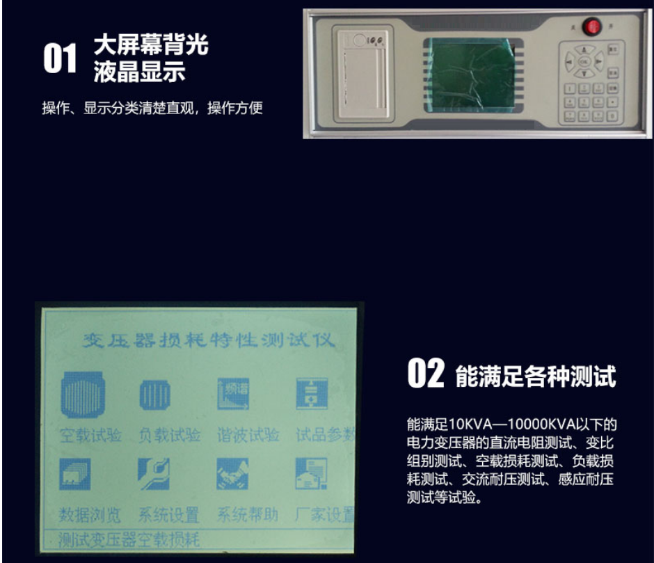 5、變壓器特性綜合測(cè)試臺(tái)采用大屏幕背光液晶顯示,操作、顯示分類(lèi)清楚直觀,操作方便;