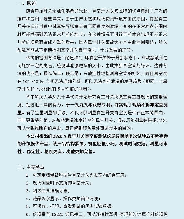 華中科技大學從九十年代初開始研究真空開關滅弧室真空度現(xiàn)場的定量檢測,經過近十年的努力,于一九九九年獲得專利,并實現(xiàn)了現(xiàn)場不拆卸定量測量。有了定量測量的手段,不僅可以測量真空開關真空度是否在正常范圍內,同時更重要的是,對某些泄漏速度較快的真空開關,通過歷年測量結果相比較,可以大致推斷它的壽命,真正起到預防意外事故發(fā)生的目的。
