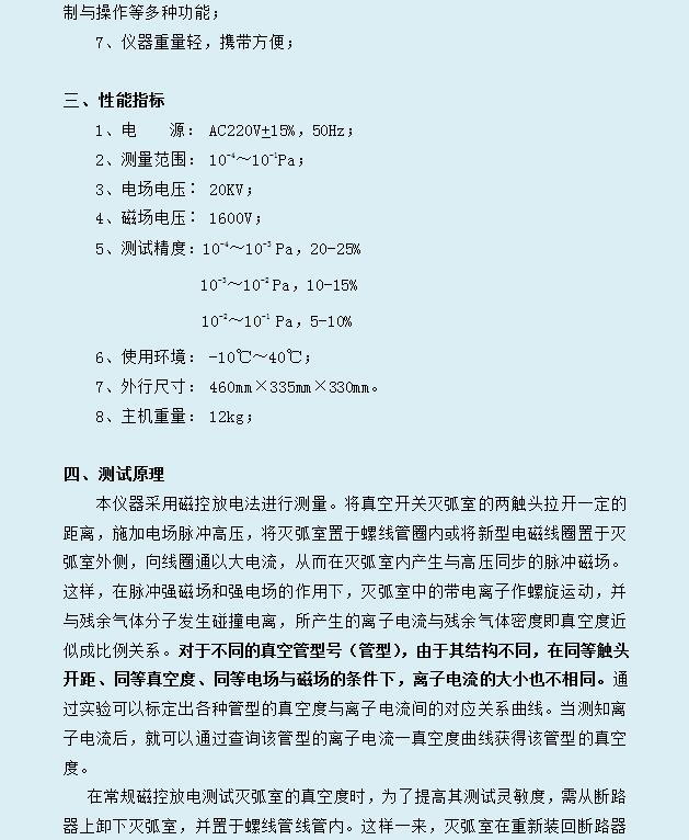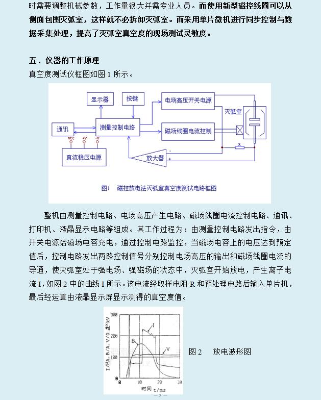真空度測試儀是真空滅弧室的真空度檢測設備,在外激勵電源、真空滅弧室的幾何尺寸、所用材料一定時,真空滅弧室的真空度與電離的電荷量有較為準確對應關系,現(xiàn)代真空度測試儀是以單片計算為主控單元,在原理上采用電離電荷量來做標定,改變了早期采用電流峰值作標定的方法,這樣在物理原理上有更好的準確性,而且有效的抑制了測試過程中脈沖電流的干擾,使測試穩(wěn)定、可靠。
