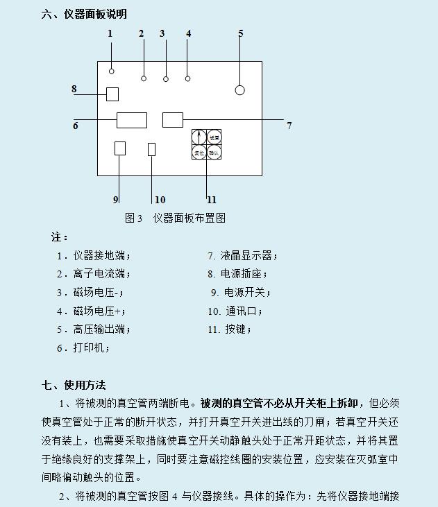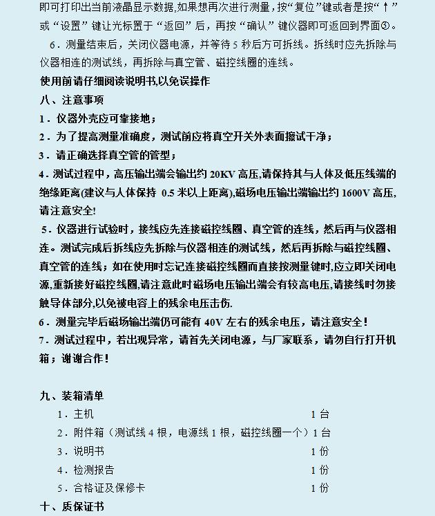 5、儀器進行試驗時,接線應先連接磁控線圈、真空管的連線,然后再與儀器相連。測試完成后拆線應先拆除與儀器相連的測試線,然后再拆除與磁控線圈、真空管的連線;如在使用時忘記連接磁控線圈而直接按測量鍵時,應立即關閉電源,重新接好磁控線圈,請注意此時磁場電壓輸出端會有較高電壓,請接線時勿接觸導體部分,以免被電容上的殘余電壓擊傷。