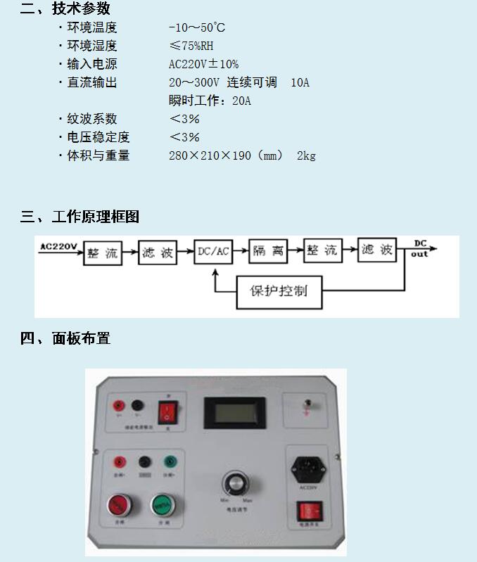 輸出范圍:電壓加0~250V直流,電流應(yīng)不小于5A.紋波系數(shù)不大于3%。