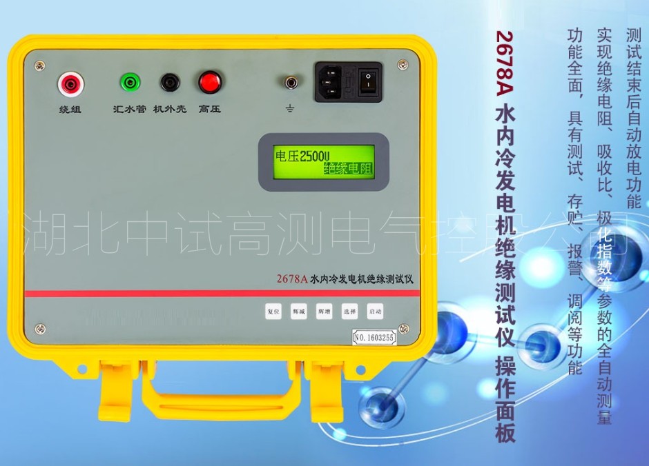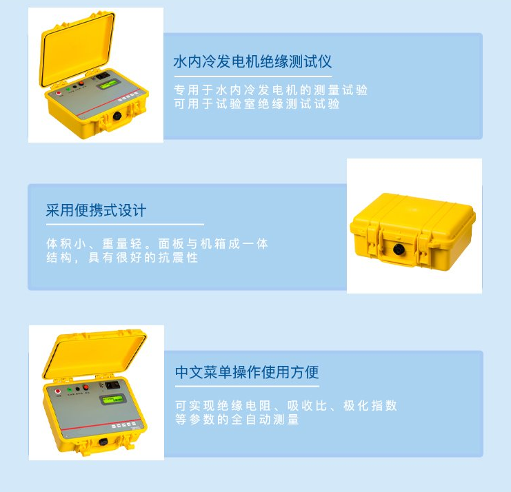 1、專用于水內(nèi)冷發(fā)電機的測量試驗,同時也可用于試驗室或現(xiàn)場做絕緣測試試驗。