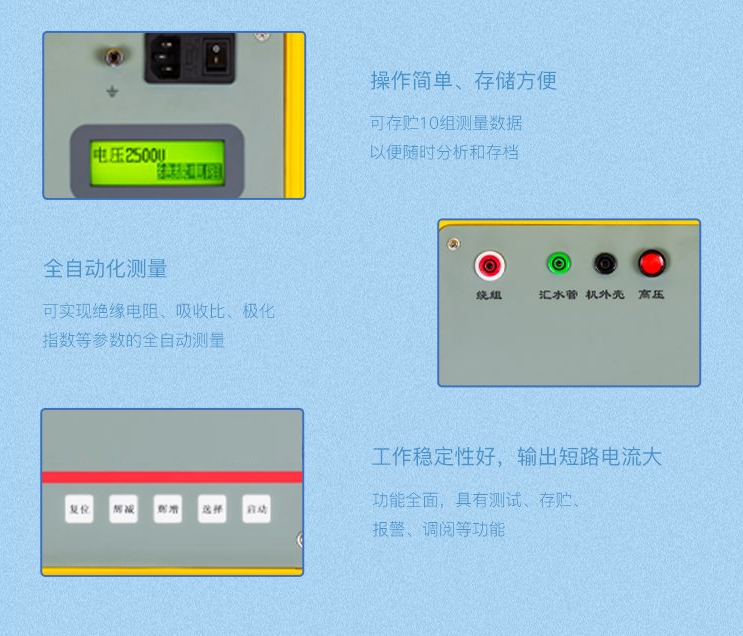 2.可實現(xiàn)絕緣電阻、吸收比、極化指數(shù)等參數(shù)的全自動測量。