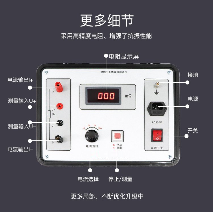 2、電力行業(yè)標準DL/T475-2006《接地裝置特性參數(shù)測量導則》規(guī)定電氣導通性應(yīng)選用專門的儀器進行測量,儀器分辨率為1mΩ,準確度不低于1.0級。我公司依據(jù)此標準研制的ZSDT-10A 接地導通測試儀是一種自動化程度很高的便攜式測試儀,專門用于接地裝置的電氣完整性測試,其各項技術(shù)指標均達到或優(yōu)于相關(guān)標準要求。該ZSDT-10A 接地導通測試儀操作簡單方便、精度高、測試速度快,復測性好、讀數(shù)直觀,是符合規(guī)程要求的理想的專用儀器,大大方便了試驗項目的開展,提高了工作效率。接地引下線測試儀、接地引下線導通測試儀、接地測試儀、接地導通測試儀、接地導通儀、接地引下線導通儀、導通接地測試儀