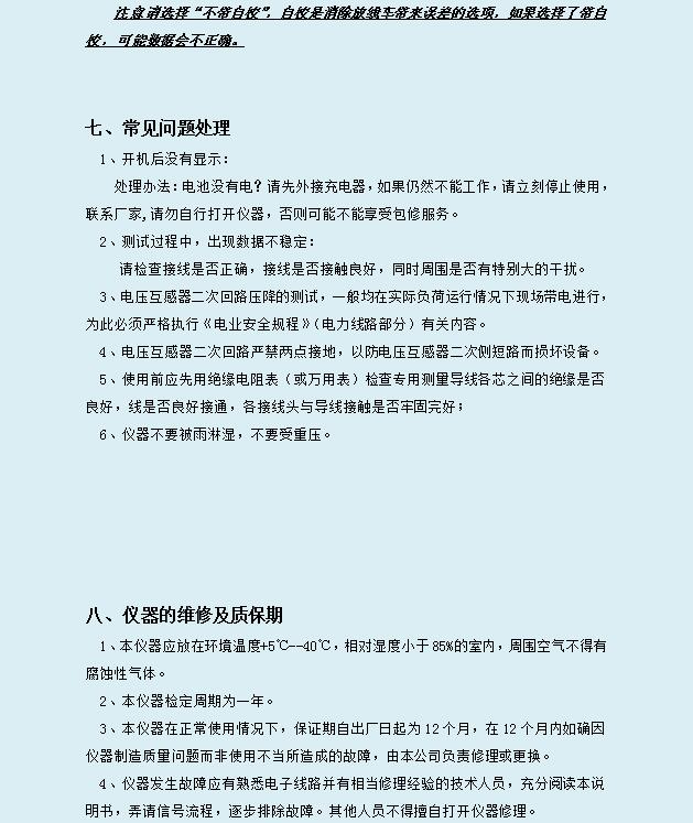 6、使用前應先用絕緣電阻表(或萬用表)檢查專用測量導線各芯之間的絕緣是否良好,線是否良好接通,各接線頭與導線接觸是否牢固完好;