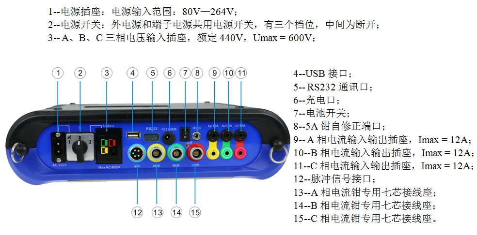 28、電壓測量插座和電源切換開關(guān)為工業(yè)級,可在600V下使用。(普通的市電用開關(guān)為250V,在380V時為超范圍使用,存在安全隱患)
