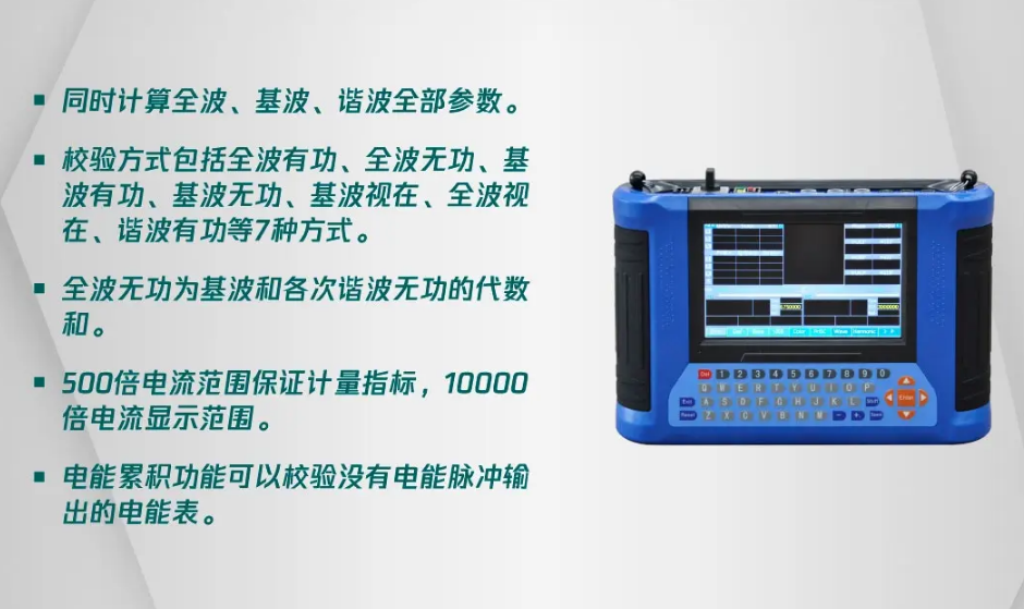 2、校驗方式包括全波有功、全波無功、基波有功、基波無功、基波視在、全波視在、諧波有功等7種方式。可校驗全波表、基波表、諧波表的有功電能準(zhǔn)確度及全波表、基波表的無功電能準(zhǔn)確度。也可校驗視在電能表的準(zhǔn)確度。