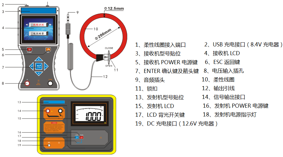 接收機(jī)為手持設(shè)備,3.5寸彩色液晶屏,動態(tài)顯示當(dāng)前相關(guān)信息。內(nèi)置高速微處理器,能實時自動檢測識別目標(biāo)電纜;附帶交流電壓檢測功能,量程AC 0.01V~600V(50Hz/60Hz)。