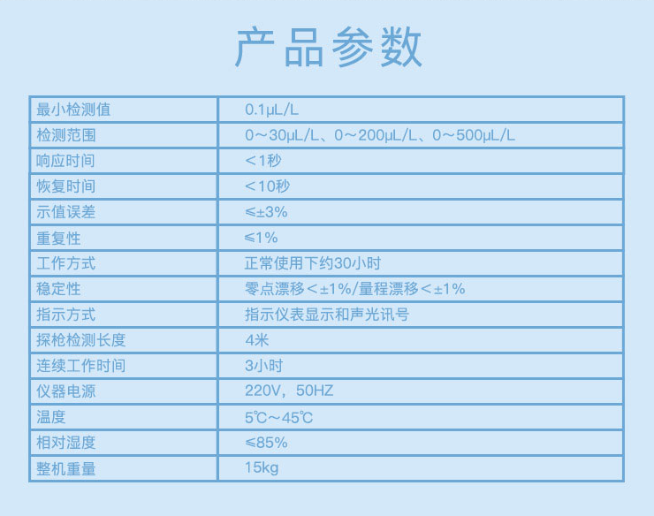 4、報(bào)警設(shè)定范圍:0.01ppm~500ppm(體積比)