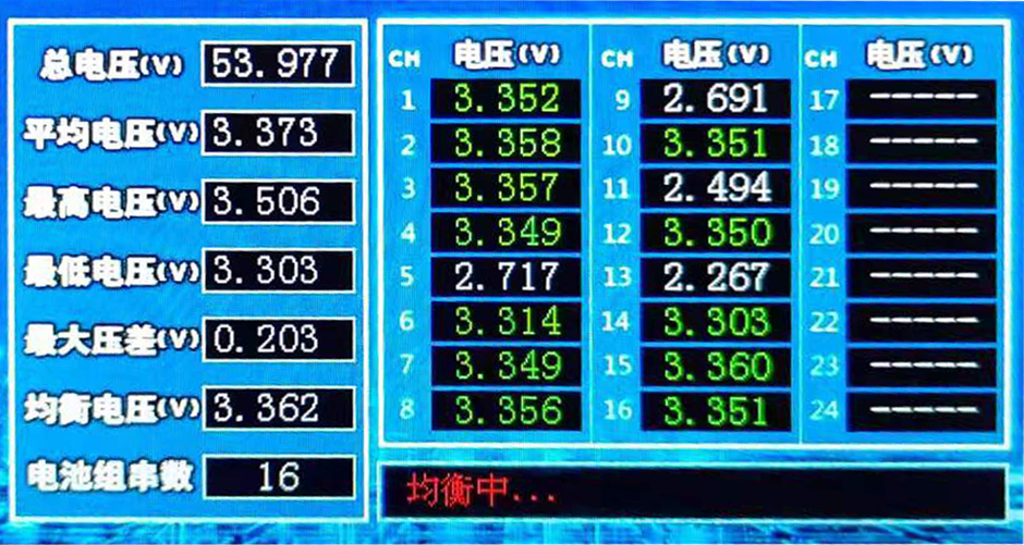 4、顯示每一串的電壓、總電壓、高串電壓、低串電壓、電池組的大壓差、平均電壓、均衡電壓、電池組串?dāng)?shù)。