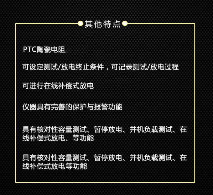 2、功耗部分采用PTC陶瓷電阻作為放電負(fù)載,完全避免了紅熱現(xiàn)象。整機(jī)由微處理器控制,液晶顯示、中文菜單。外觀設(shè)計(jì)新穎,體積小、重量輕、移動(dòng)方便。各種放電參數(shù)設(shè)定完成后,自動(dòng)完成整個(gè)恒流放電過程。完全實(shí)現(xiàn)智能化。