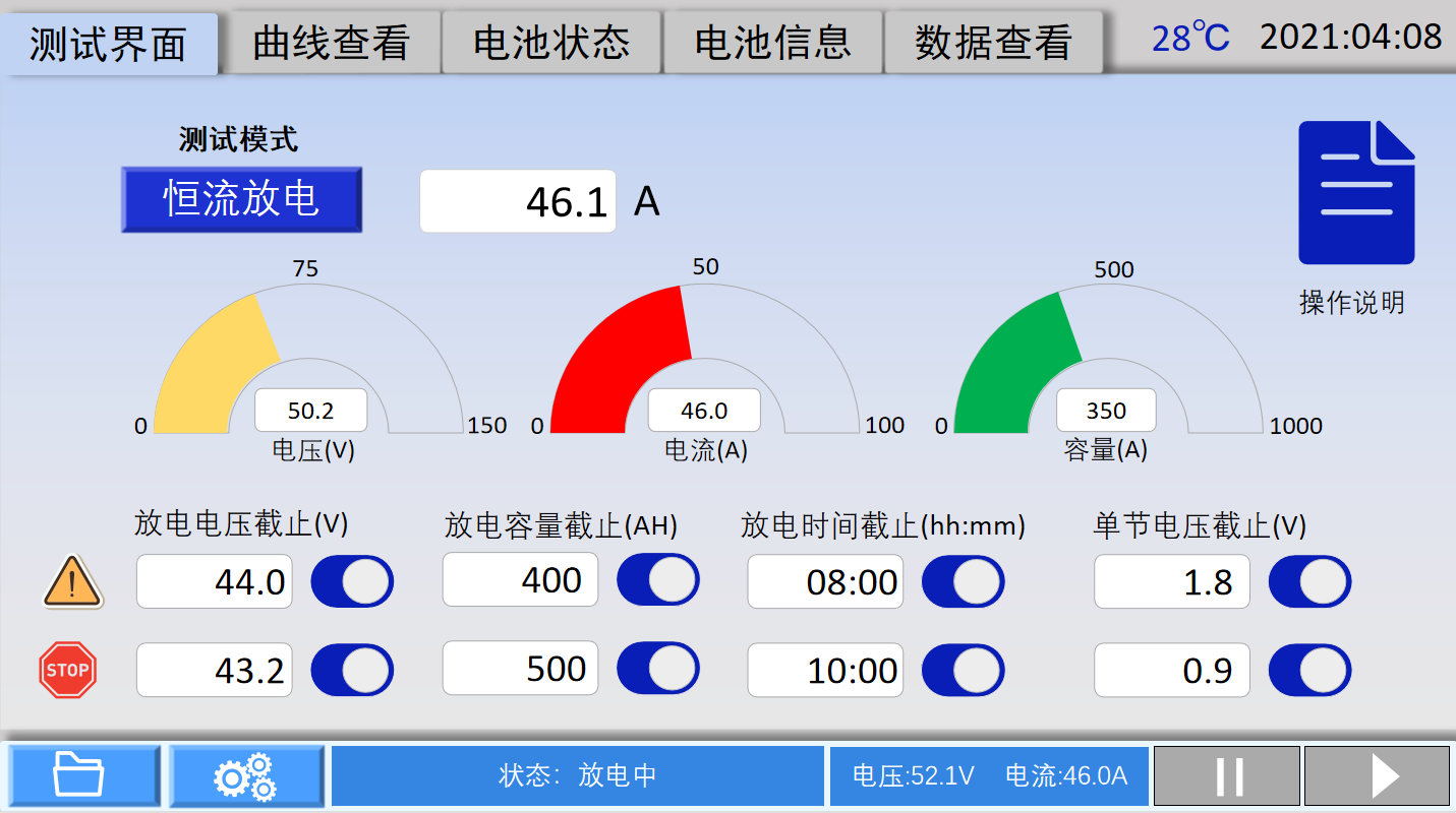 2、智能芯片控制。放電過程智能控制,跟隨蓄電池電壓下降自動調(diào)整,保證恒流放電。單節(jié)蓄電池電壓實時采集,并以曲線方式展示,便于評估分析,同時智能分析電池電壓狀態(tài),并作出評估。智能計算放電容量與放電小時率之間的轉(zhuǎn)換,實現(xiàn)電池容量狀態(tài)佳評估效果。可設(shè)定多種門限閥值,智能判斷。