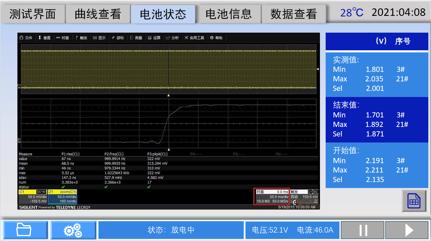 6、電池充放電過程中,各單體電壓實時檢測和顯示:并在主機屏幕上呈現(xiàn)出各單體電壓柱狀圖的變化軌跡,支持數(shù)據(jù)表格顯示,還能自動實時呈現(xiàn)出電壓高與低的單體,幫助您快速分析單體變化的趨勢。