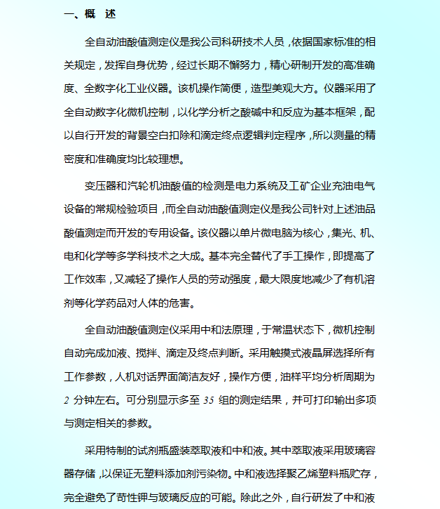 2、變壓器和汽輪機油酸值的檢測是電力系統(tǒng)及工礦企業(yè)充油電氣設(shè)備的常規(guī)檢驗項目,針對上述油品酸值測定而開發(fā)的專用設(shè)備。該儀器以單片微電腦為核心,集光、機、電和化學等多學科技術(shù)之大成?;就耆娲耸止げ僮?,即提高了工作效率,又減輕了操作人員的勞動強度,大限度地減少了有機溶劑等化學藥品對人體的危害。