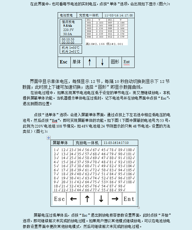 8、具有單體電壓實時檢測功能:在主機屏幕上自動實時呈現(xiàn)出各單體電池的當前電壓,自動實時呈現(xiàn)六節(jié)電壓低的單體電池。