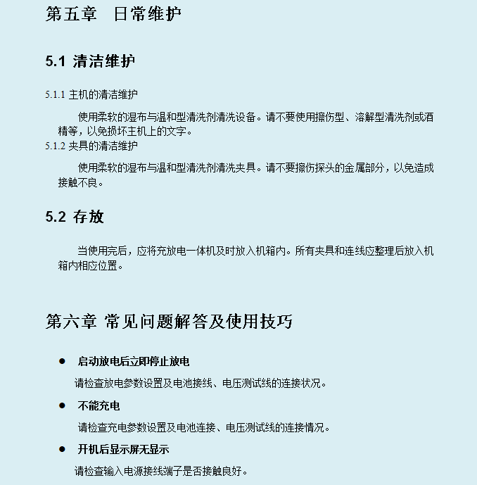 測試線極性接反;測試放電電流超過或低于設定值;電壓高于或低于設定值;溫度異常;風扇故障等。儀表自動報警并停止放電。 |