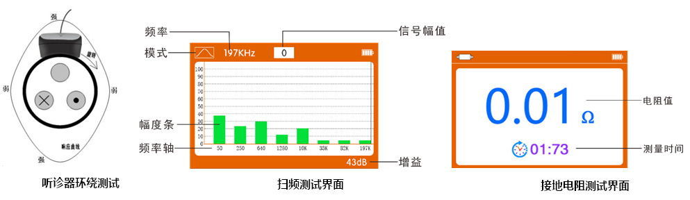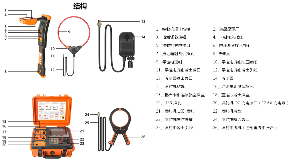 內(nèi)置接收線圈、柔性卡鉗、聽診器、鱷魚夾測試線(電壓測試) |