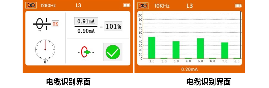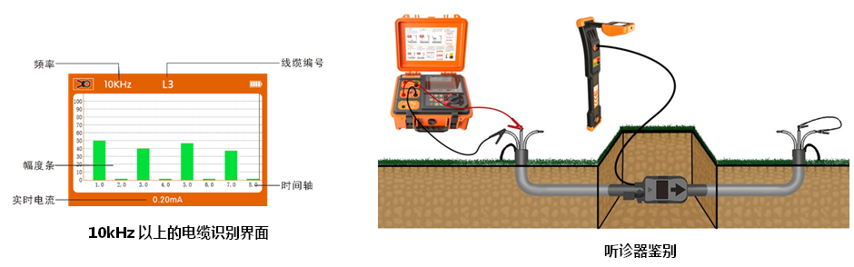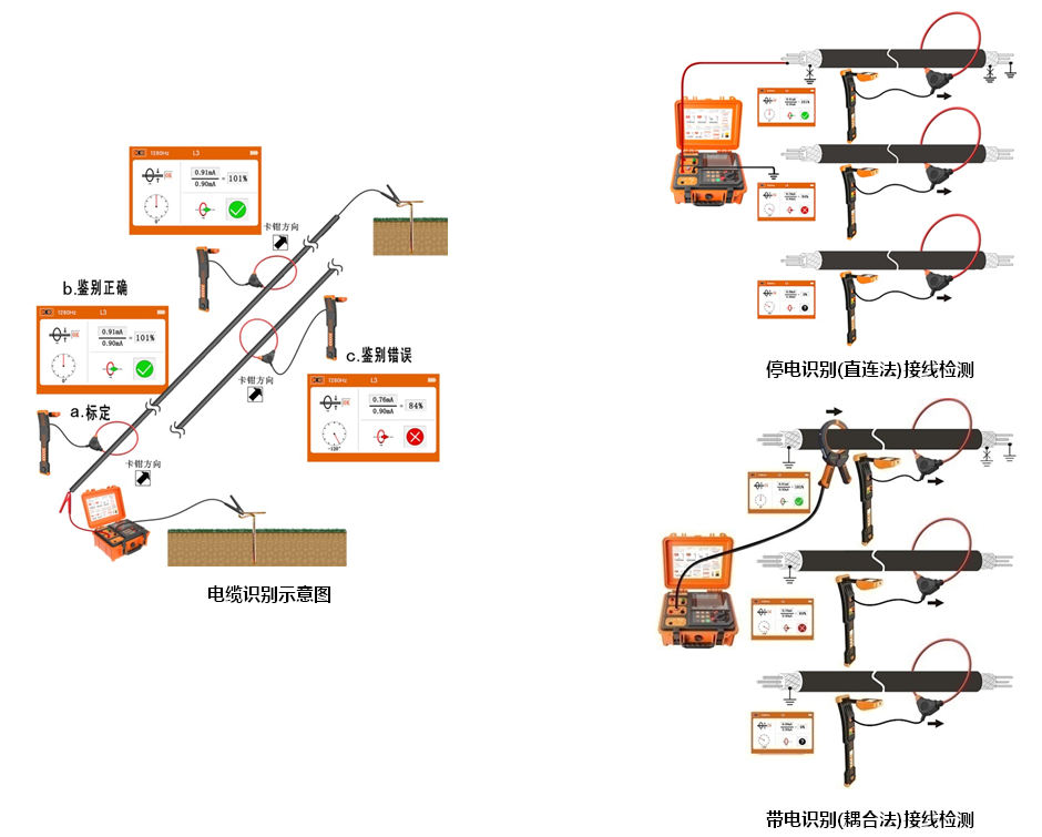 鑒別方式:柔性卡鉗智能鑒別、聽診器鑒別; 可標定電纜數(shù)量:1~10條; 標定值:接收信號與發(fā)射信號的電流百分比在標定值75%~135%之間為識別成功條件之一; 方向性:發(fā)射鉗、接收鉗與加載信號必須方向一致,為識別成功的條件之一 |