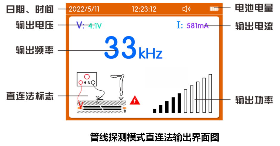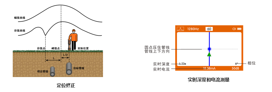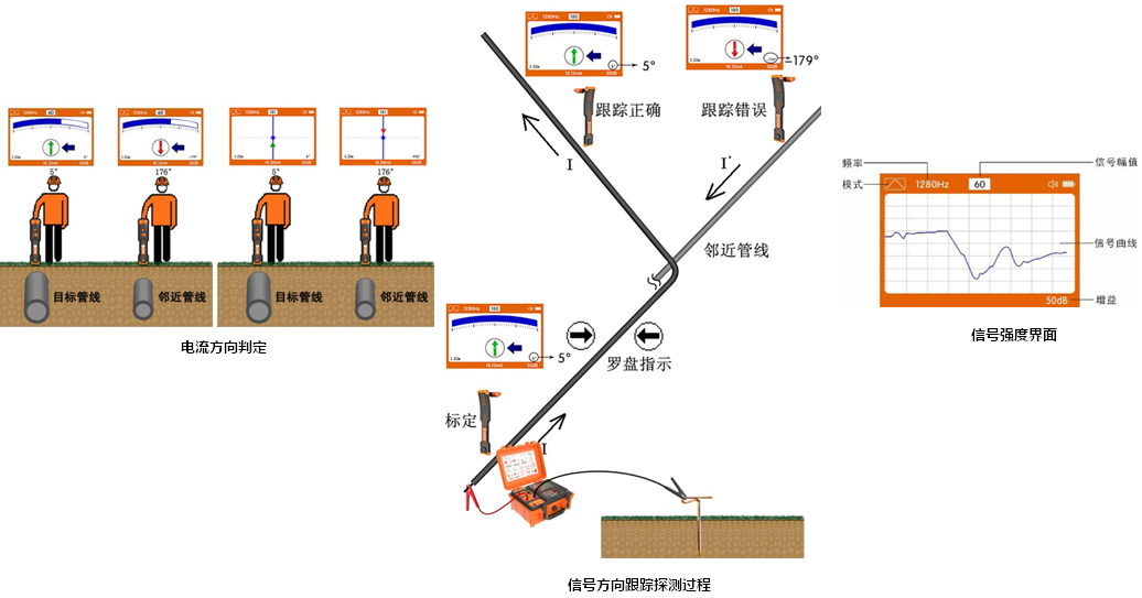2、經(jīng)典定位模式:羅盤、方向和信號幅值顯示,直觀顯示管線左右方向。