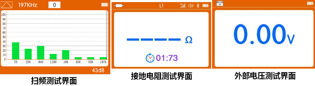 管線探測(線纜位置跟蹤、方向顯示、深度測量、電流測量)、電纜識別、接地電阻測試、外部電壓測試 |