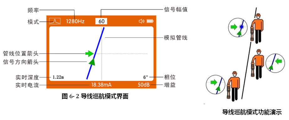 3、導線巡航模式:360°全方位管線路徑指示,連續(xù)顯示深度、電流和管線相對位置。界面簡潔直觀,無需經(jīng)驗即可進行操作
