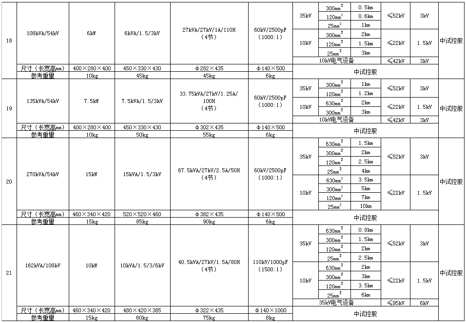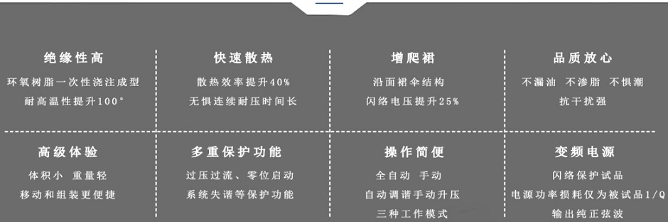 3·可以完成交流被測試品:電力電纜、變壓器、斷路器/開關(guān)、開關(guān)柜、隔離開關(guān)、避雷器、電壓互感器、電流互感器、套管、支柱絕緣子、電抗器、母線、隔離開關(guān)、輸電線路、發(fā)電機、電動機、熔斷器、電容器、接觸器、配電箱、絕緣材質(zhì)、變電站系統(tǒng)等各種被試品的預(yù)防交流試驗和交接交流耐壓試驗;