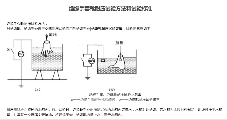 ? 絕緣靴及絕緣手套耐壓試驗,周期為半年,試驗過程中不允許擊穿,同時絕緣靴泄漏電流不大于限定值。