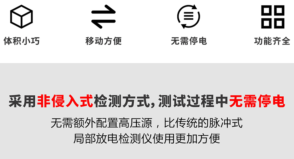 5、采用非侵入式檢測方式,測試過程中無需停電,無需額外配置高壓源,比傳統(tǒng)的脈沖式局部放電檢測儀使用更加方便;