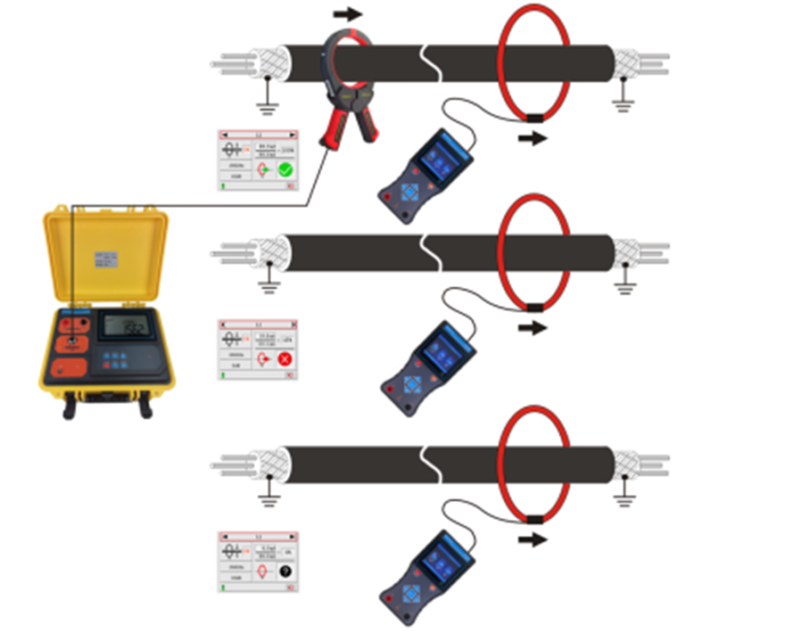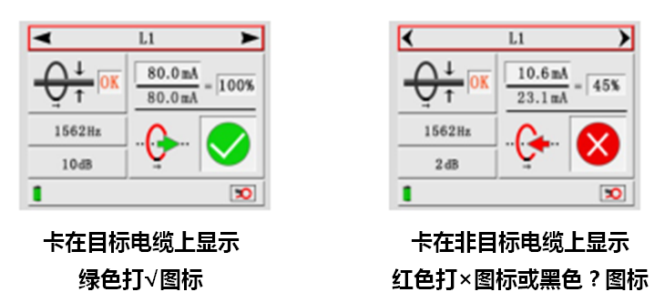 停電識別時:采用直連輸出脈沖電流,給電纜線芯注入脈沖編碼電流信號,該電流在目標(biāo)電纜周圍產(chǎn)生電磁場,供接收機(jī)和柔性電流鉗檢測、解碼、識別;因電流有方向性,所以檢測也具有方向性。