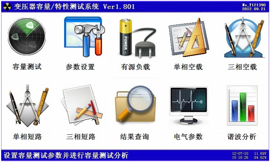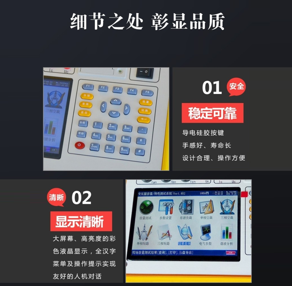 3·容量測試結(jié)果準確率達100%。它一種設(shè)備相當于四種設(shè)備:有源變壓器容量測試儀+變壓器損耗參數(shù)測試儀+諧波分析儀+示波器。它可對各種變壓器的容量、空載電流、空載損耗、短路損耗、阻抗電壓等一系列工頻參數(shù)進行精密的測量,并能測量空負載試驗時的電壓、電流失真度和諧波含量,還可以進行矢量分析。