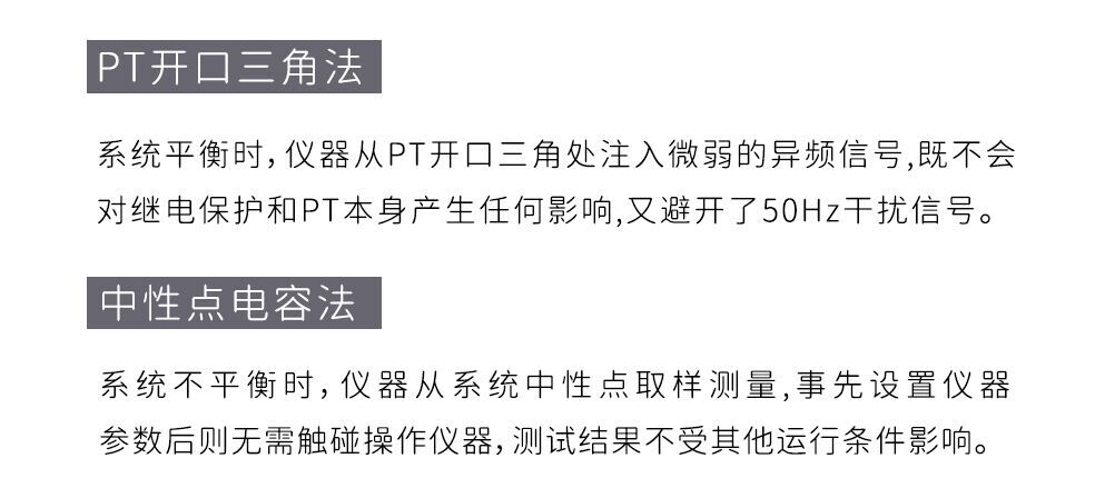 系統(tǒng)平衡時(shí),儀器從PT開(kāi)口三角處注入微弱的異頻信號(hào),所以既不會(huì)對(duì)繼電保護(hù)和PT本身產(chǎn)生任何影響,又避開(kāi)了50Hz干擾信號(hào),同時(shí)測(cè)試儀的輸出端可以耐受100V的交流電壓,若測(cè)量時(shí)系統(tǒng)有單相接地故障發(fā)生,亦不會(huì)損壞PT和測(cè)試儀,因而無(wú)需做特別的安全措施,使這項(xiàng)工作變得安全、簡(jiǎn)單、快捷。