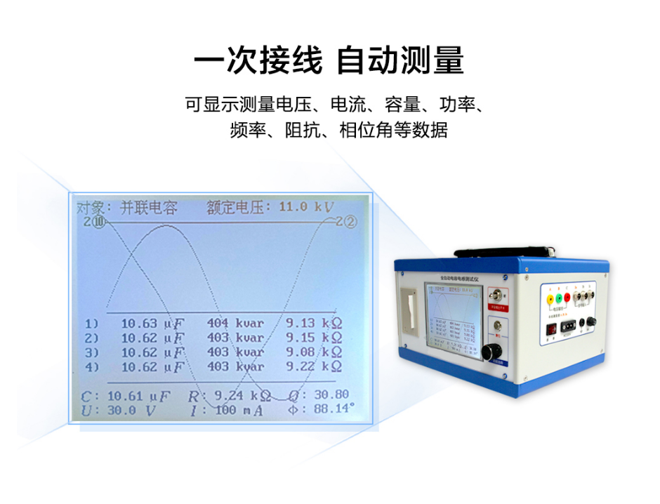 6、儀器可顯示出在測(cè)量電容器或電抗器的過(guò)程中測(cè)量的電壓、電流、功率、相位角、阻抗等數(shù)據(jù),以便更好的分析問(wèn)題所在;