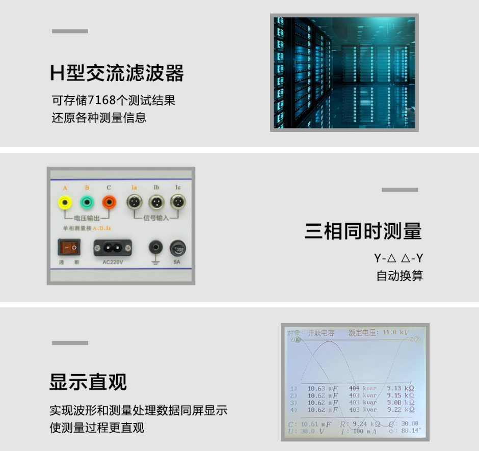 3、可三相同測(cè)或同時(shí)測(cè)量三只并聯(lián)電容器或電抗器;