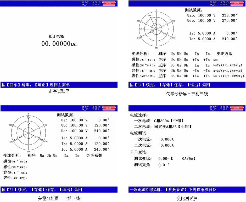 4、可顯示被測電壓和電流的矢量圖,用戶可以通過分析矢量圖得出計(jì)量設(shè)備接線的正確與否。同時(shí),在三相三線接線方式時(shí),可自動(dòng)判斷48種接線方式;追補(bǔ)電量自動(dòng)計(jì)算功能,方便使用人員對(duì)接線有問題的用戶計(jì)算追補(bǔ)電量。