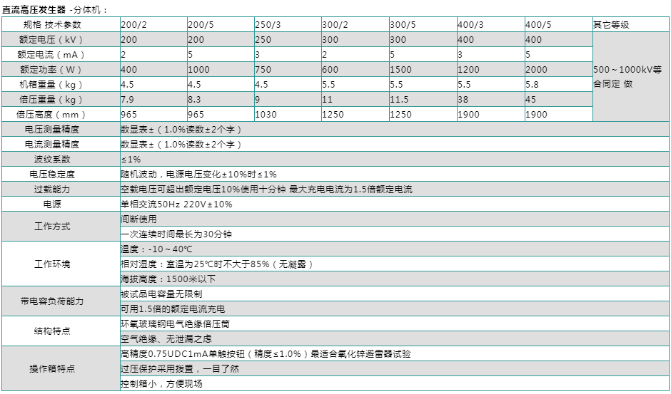 1、直高發(fā)采用了新技術(shù)、新材料和新器件,具有輸出功率大、體積小、重量輕的特點,有可靠的過壓、過流及零位合閘保護功能,帶0.75倍電壓鎖存功能,并配有時間繼電器,能在試驗中設(shè)置定時聲訊報警。整個儀器便于攜帶,操作方便,安全可靠,特別適用于電力部門現(xiàn)場試驗。