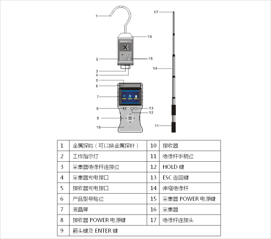 2、采集器連接金屬探鉤可以掛在110kV以下的裸導(dǎo)線上測試,節(jié)省操作人員體力,采集器連接金屬探針,可以對二次帶電指示器的驗(yàn)電孔進(jìn)行驗(yàn)電。