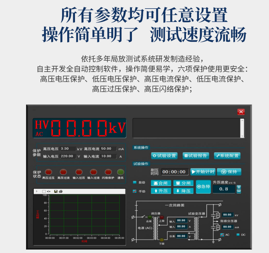 6、所有測(cè)試參數(shù)可提前進(jìn)行設(shè)置,能達(dá)到高壓電壓放電擊穿電壓準(zhǔn)確記憶、儲(chǔ)存、復(fù)位一系列功能;自動(dòng)掃描時(shí)間設(shè)定,自動(dòng)存儲(chǔ)電老化過(guò)程中的時(shí)間、電壓、電流等詳細(xì)記錄,方便用戶查看;