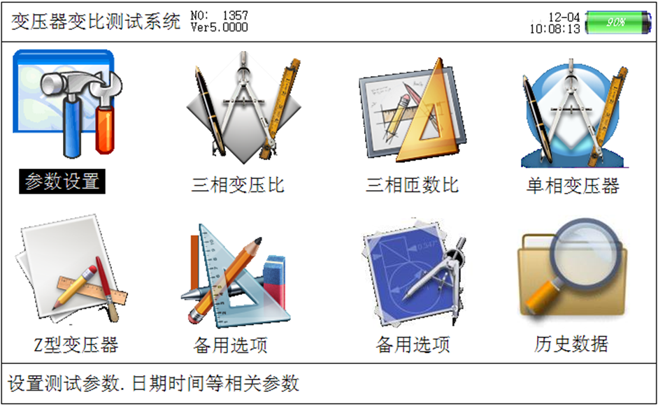 2·功能強大:既可進行單相測量,又可實現(xiàn)三相繞組的自動測試,單相、三相均可測量極性,一次完成測量AB、BC、CA三相的變比值、誤差、分接位置、分接值等參數(shù),可自動識別組號(0-11等同于1-12)。
