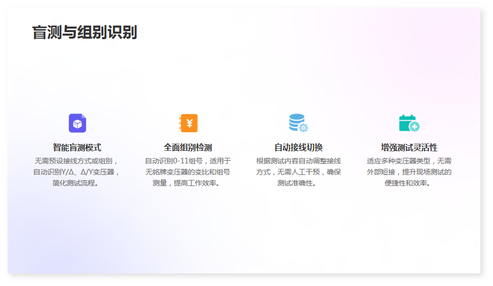 4·盲測功能:無需選擇接線方式,無需選擇接線組別,測量Y/△、△/Y變壓器無需外部短接,可根據(jù)選擇的測試內(nèi)容自動切換接線方式。完全可以對沒有銘牌的變壓器進行變比和組號的測量。